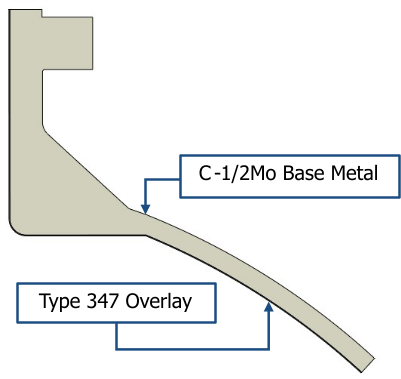 The nozzle in question is shown in Figure 1 and the geometry was extracted from the original analysis with the generous assistance of EMRE.  The 2D axisymmetric model includes the nozzle itself along with a sufficient portion of the vessel head to limit boundary effects.  The model also includes a type-347 weld overlay along the internal wetted surface.