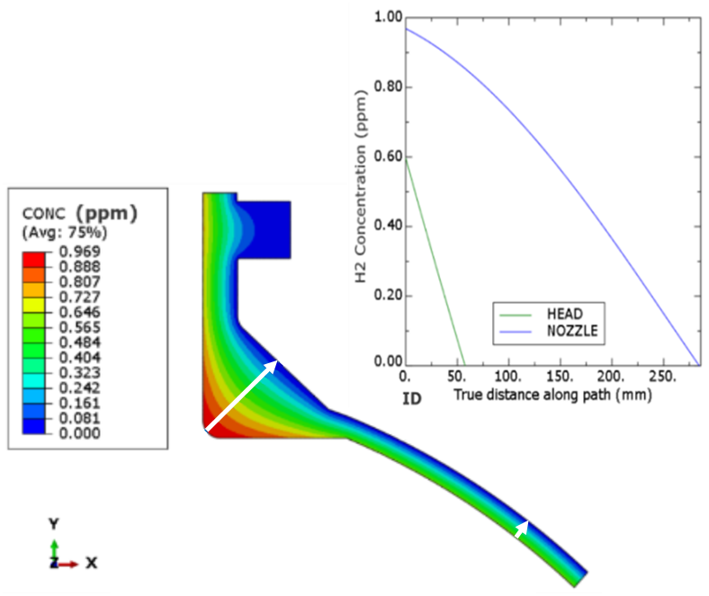 A constant isothermal temperature distribution of 400 °C (752 °F) was assumed in the EMRE model and replicated in our analysis.  For establishing the thru-wall hydrogen partial pressure distribution, both approaches included a mass-diffusion analysis.  Given that the operating conditions (PH2 = 4.3 MPa) were identical, the geometry was identical, and the material solubility and diffusivity was derived from the same source [6], the results were unsurprisingly also identical, as demonstrated in Figure 2.  An excellent example of the effect of three-dimensional diffusion is observed along the thickest pathway of the nozzle root. Presence of the overlay reduces the hydrogen partial pressure as seen by the base metal ID surface from 4.3 MPa down to 3.8 MPa at this location, while in the far field head region this reduction is more pronounced, dropping to a value of 1.5 MPa (matching 1-D hand calculations). Accounting for the effect of additional thickness at the root location, without the 3-D diffusion effects, the base metal ID would have been assumed to see just over 2.9 MPa—an underestimation of the hydrogen partial pressure of over 30%!