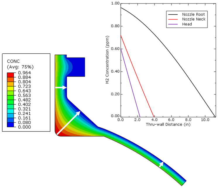 Hydrogen partial pressure distribution through the component wall is not specified but rather solved for directly through a mass-diffusion analysis and application of the Sievert Law.  This is particularly important for configurations that involve regions of complex geometry which promote three-dimensional diffusion effects.