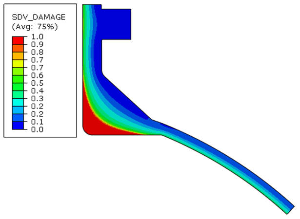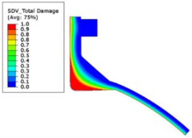 Some significant differences are observed between the Becht and EMRE models.  Although the HTHA creep strains are used in the calculation of the damage measure, the Becht model does not use ductility exhaustion as a means of quantifying failure.  Becht’s failure criterion is based on correlation between macroscopic structural damage and toughness loss in comparison to a grain boundary void growth damage parameter.  The way damaged material reacts is also different – in the Becht model, damaged material observes a corresponding reduction to elastic modulus, which is common to the EMRE work, but is significantly less severe by comparison.  Given these differences in approach, it was expected that some differences in results would be observed, but given the good experimental validation, we decided to analyze the exact same nozzle under the same conditions to see how the Becht model would perform.