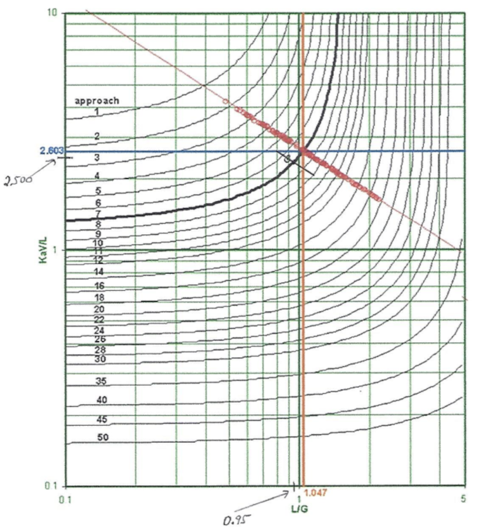 The design L/G was 1.047 and the corresponding KaV/L was 2.603 for a 7o F approach to the 65o F wet bulb.