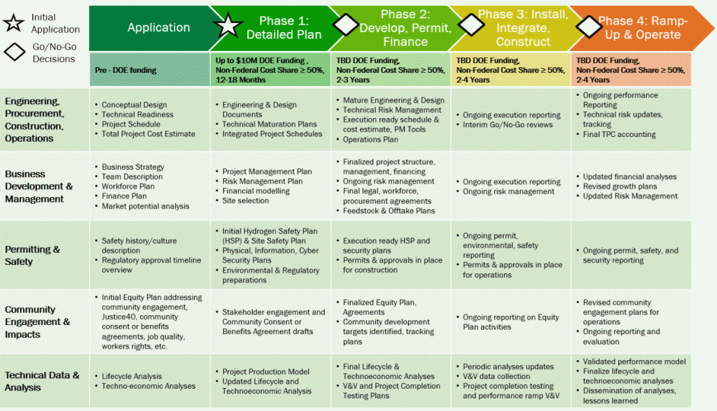 The DOE regional clean H2  hubs selection process has involved and will continue to require the integration of multiple criteria and inputs from various governmental agencies. An example of activities and deliverables likely expected to be completed in each phase is shown in the following figure: