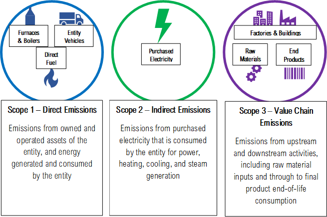 The following graphic summarizes the definition and boundaries for Scope 1, 2, and 3 emissions.