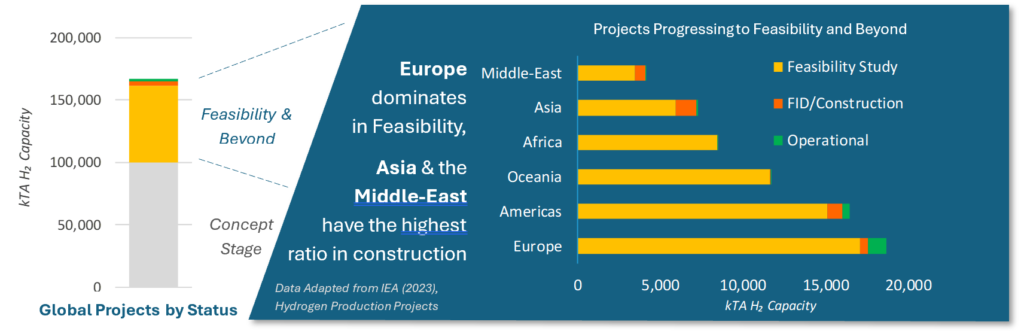 Industrial confidence in executing projects at scale combined with regional demand and resource advantages in the Middle East and Asia have led to low LCOH projects gaining traction.