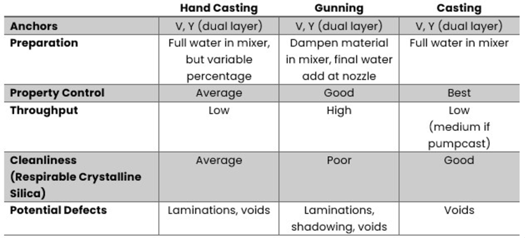 In broad strokes, installation of monolithic refractory includes the mixing and the placing, which is covered within this article, and the dryout, which will be covered in a later post. This peculiarity allows flexibility of material properties, lining shape, and a rapidity of installation that suits the petrochemical industry. However, the installation steps can vary greatly in required equipment and final result (see Figure 1), which necessitates attention to detail to ensure good quality. When a root cause failure analysis points to a problem with the refractory, the quality of installation and dryout are the common culprits. Problems with the quality can occur without major visual cues on the lining itself.