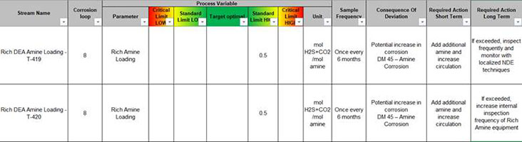 Additionally, reviews of IOW exceedance can identify areas where existing materials are not suitable for the current operation and can recommend upgraded materials for new limits. For example, most amine regeneration units have a lower limit around lean amine loading to prevent over-stripping of the amine which can lead to accelerated corrosion. If IOW limits around lean amine loading frequently undershoot the lower limit, upgrading of certain piping circuits to a more corrosion resistant material may be required.