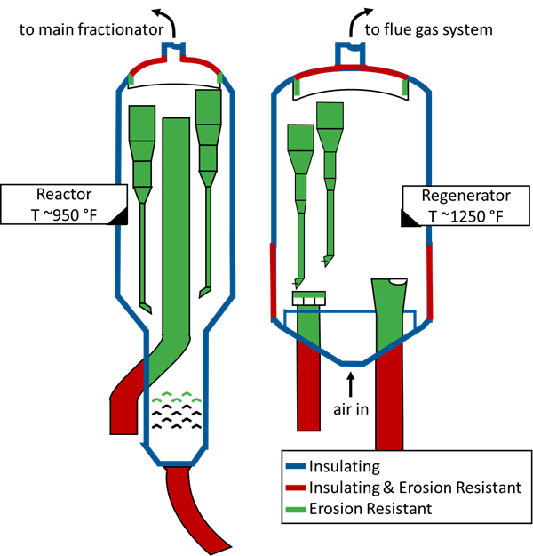 One of the most complex refractory consumers is the Fluid Catalytic Cracking Unit (FCCU), requiring multiple combinations of different refractories. These units require circulating catalyst and high temperatures to make their products, both of which would be a challenge for bare steel vessels. In the FCCU, refractory materials generally fall into three categories: insulating, erosion resistant, and partially insulating, partially erosion resistant. See Figure 1 below for additional details.