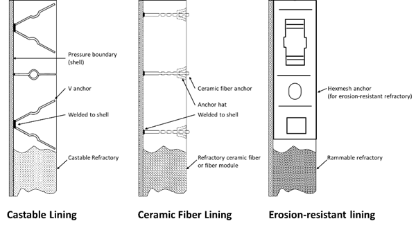 Figure 3. A schematic showing generic refractory lining details for a castable, and ceramic fiber, and a thin-layer rammable lining with anchors.