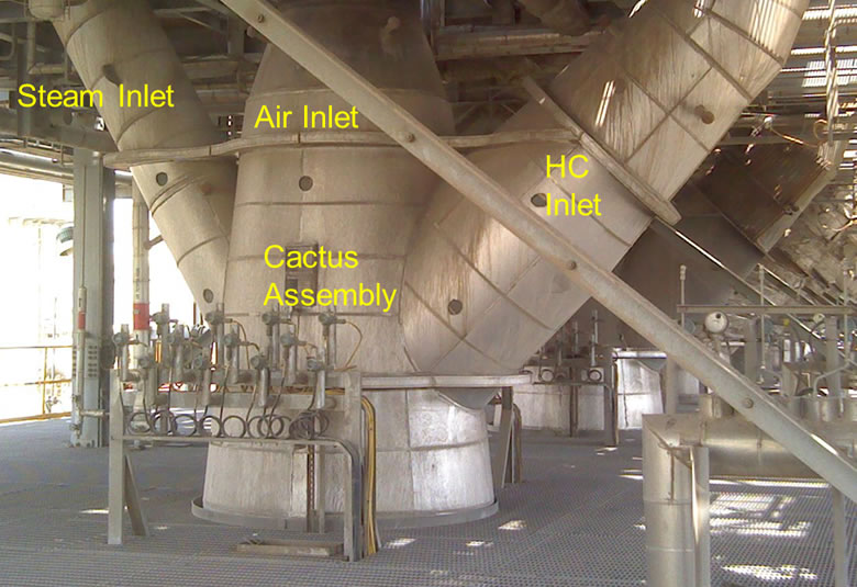 The CATOFIN® licensing technology is a process for propane dehydrogenation (PDH) that is employed at numerous facilities worldwide. Licensed by Lummus Technology, it is a process for production of olefins, such as propylene (from propane) and iso-butylene (from iso-butane). This is a continuous PDH process that uses sequential cyclic operation of multiple fixed-bed reactors through automated programming to control the key phases of the process. The unit employs large diameter main piping headers for the air and hydrocarbon (HC) inlet and outlet circuits (see Figures 1 and 2), as well as components called cacti that connect to each reactor and multiple piping branches (see Figure 3). The headers operate at relatively low pressure or vacuum conditions, but relatively high process temperatures on the order of 570°C (1060°F) to 705°C (1300°F), depending on the region of the system. The headers are hot-walled configuration, type 321H SS and employ numerous bellows type expansion joints due to the significant thermal growth at these temperatures. Regions of the cacti are typically cold-walled (refractory lined) and transition to hot-walled in some designs, with 310H SS material transitioning to low chrome on the HC and steam branches.