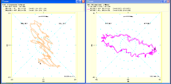 Figure 1 – The Orbit Plots Above Show Possible Indications Of A Coupling Grid Lock Up. At Left Are 5 Rotations Of The Bull Gear Drive End Unfiltered Orbit. At Right Are 5 Rotations Of The Motor Drive End Orbit. Appx. 32 Loops Are Present In Both Orbit Plots. This Is Two Times The Number Of Rubber Stops Installed In The Coupling Grid End Turns.
