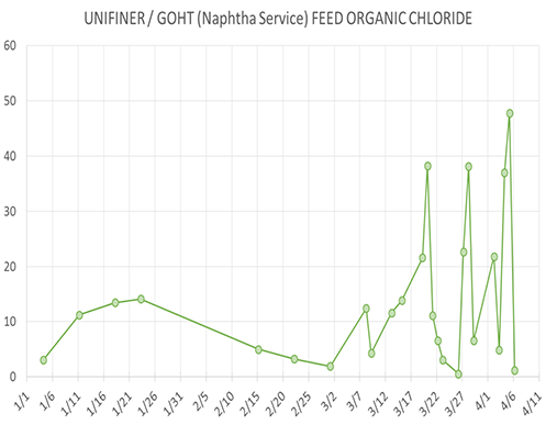 A USGC refinery had been suffering for some time with high levels of organic chlorides in the naphtha feed to the NHT. The chloride level was so high that the available wash water rate was insufficient to avoid severe exchanger fouling and the resulting reactor effluent so corrosive that the piping was holed through resulting in loss of primary containment.