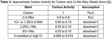 As shown in Table 2 (from [2]), carbon activity is directly related to the presence and stability of carbides in the steel. From a resistance standpoint, the assumption here is that carbide presence will also have a beneficial effect on the activation energies for diffusion and creep local to the voids. Separate scaling factors are used for diffusion and creep, but as an example, the creep activation energy in the model scales smoothly from the carbon steel value at ac =1 to commonly accepted values for 2.25Cr-1Mo at ac = 0.05.