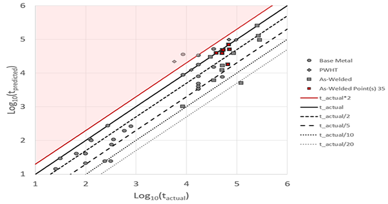 The one as-welded outlier that is just beyond -20x on life is API RP 941 plotted point 37 – while this single point may just represent extremely excellent performance (easily captured by the model), it seems possible that temperature and partial pressure could’ve been reported as design rather than operating. While certainly anecdotal, the scatter seems to be smaller for the cases with the most information available (such as as-welded points 35).