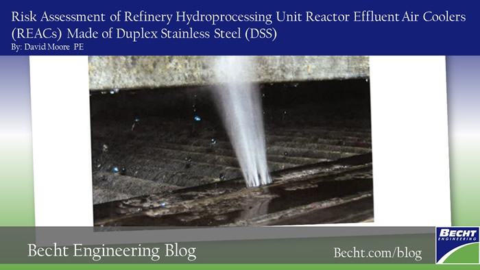 Becht has been helping clients to assess the risk of cracking in their DSS REACs. Dave Moore, a Becht Materials and Corrosion Advisor, was the author of the MTI publication. In addition, Becht has been contracted by the API to survey the refining industry to gather a larger data base of experience with DSS REACs and help to define factors associated with cracking. We can help your specialists with risk assessments of your DSS REACs.