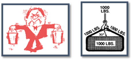 Let’s look at the 30-degree angle. Assume your two slings have a capacity of 5,000 – pounds each and your load is 10,000 pounds. It is intuitive to think each sling will have half the total load. However, if the slings are at 30-degrees, the force applied is 10,000 pounds for each leg. In this case the slings could be overloaded by 100 percent!!! The same tension is applied to the other hardware in the system and will likely be overloaded as well.