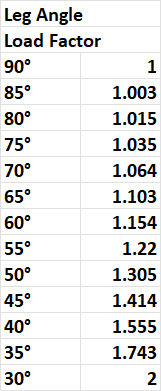 Then multiply the dividend by the “Leg Angle Load Factor” from the table;