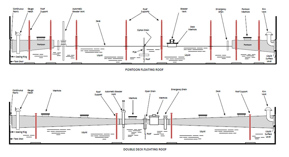 • The sketches shown illustrate the above single deck and double deck floating roof, with the critical components for these structures. Roof designs shown have been used in tanks as large as 345 ft. diameter, to store Crude Oil.