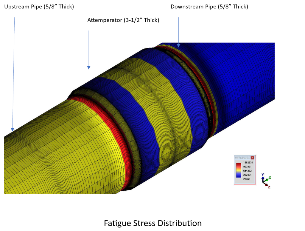 It is important to note that this configuration utilized standard weld end transition details that are customarily used with significant thickness transitions such as at valves.  It is also important to note that there have been several instances of significant cracking in this area in various applications (especially in CSEF steels) throughout industry.  In this particular case (grade 22 steel), we looked at several configurations as shown in Table 1.  Changing the existing taper to a 3:1 taper reduces the secondary stresses by a factor of 1.2 to 1.3.  It increases the mean cycles to failure by a factor of 2 to 2.5.  These increases provide some improvement, but in this case, it would not be enough to prevent cracking. Changing the attemperator to one with 1” wall thickness reduces the secondary stresses by a factor of 1.7 to 2.0.  It increases the mean cycles to failure by a factor of 5 to 7.  These are significant increases, but in this this case, prevention of cracking is not assured. Changing the attemperator to 5/8” wall thickness to match the pipe reduces the secondary stresses by a factor of 2.2 and increases the mean cycles to failure by a factor of 12.  These are significant increases, and cracking would no longer be expected.