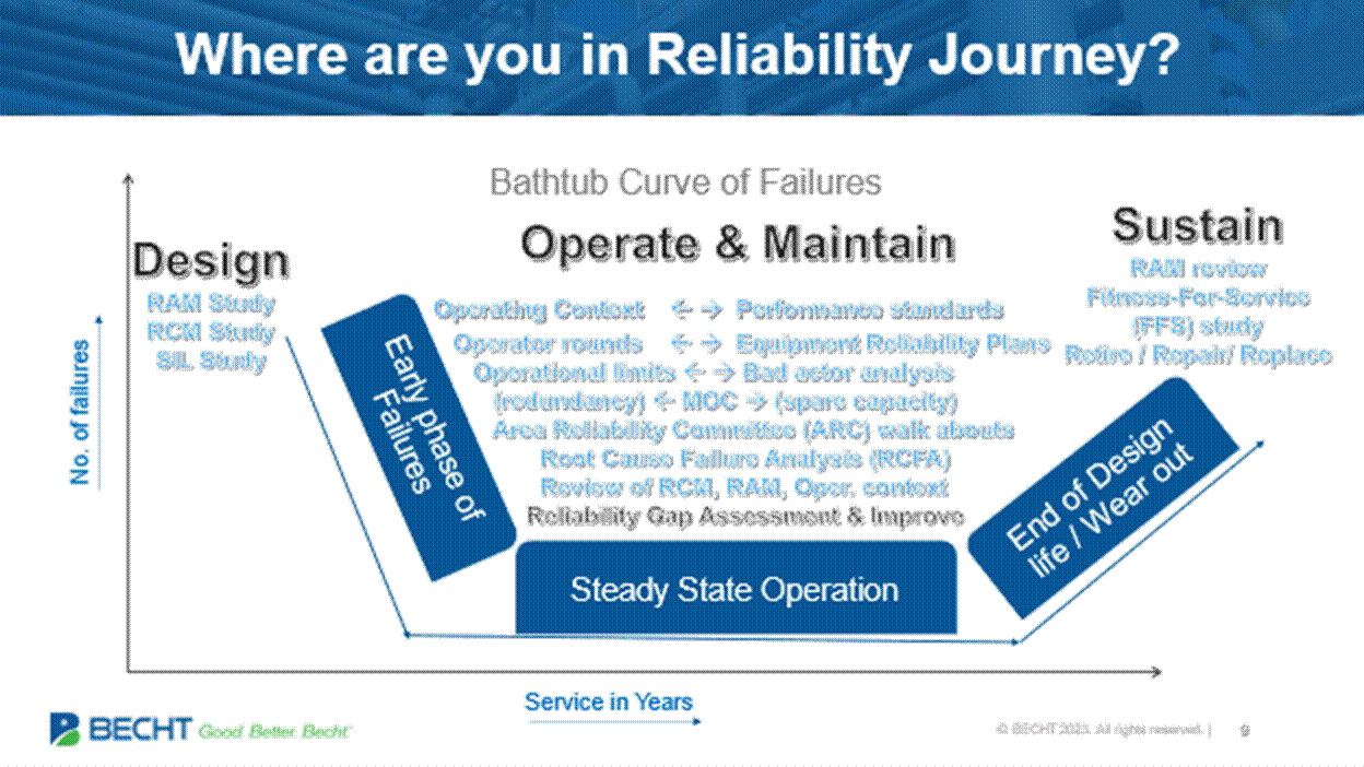 Every organization is positioned in a different timeline and traverse through the phases of challenges over a period. Challenges vary from design phase to post-commissioning phase and steady state operational phase and end of life. The focus area and the strategies should be evolving across the organization and re-aligned to tackle the challenges of the reliability.