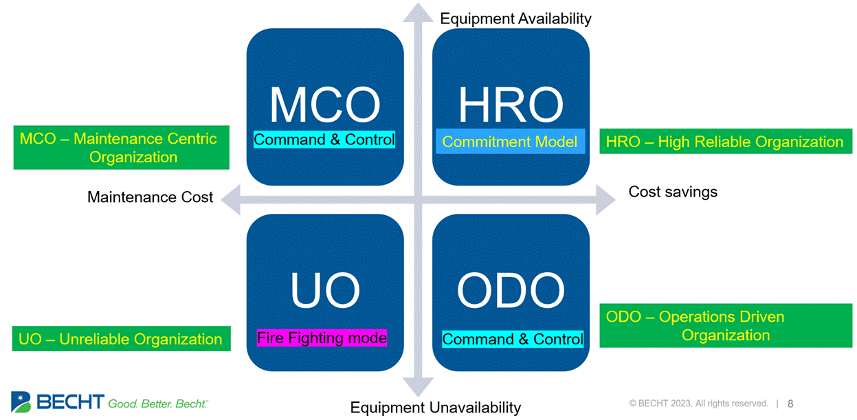 Every organization wants to maximize margins through high availability at an optimum cost of maintenance and become a High Reliable Organization (HRO). Based on the state of equipment availability and the cost of maintenance, organizations can be classified into 4 categories typically. Characteristics of the organization culture place them into different quadrants;