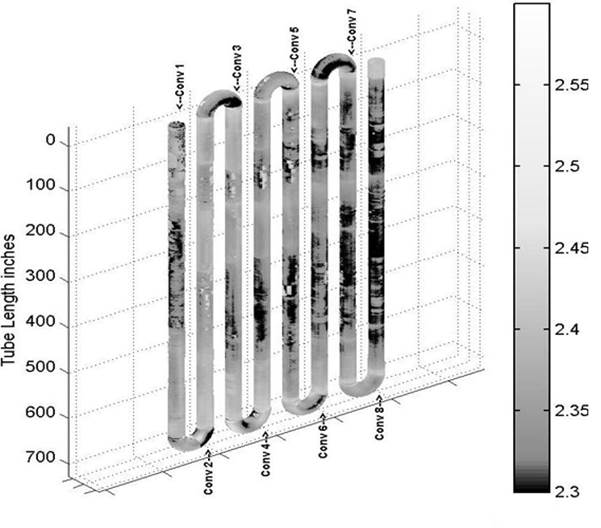 Often refiners will choose to utilize ultrasonic (UT) based Intelligent Pigging technology directly after cleaning of the heater coils to: (1) Verify Coil Cleanliness (SEE IMAGE), (2) Detect/Quantify damage mechanisms and (3) Establish current coil condition to enable fitness for service and remaining life expectancy.  The latest available UT intelligent pigging technology simultaneously maps both the “interior surface” and “pipe wall remaining thickness” as the instrument traverses through the heater serpentine coil.  High resolution dimensional maps generated of the coils interior surface can be used in creating 2-dimensional (2D) and 3-dimensional (3D) images illustrating presence of internal fouling (ie. coke, scale, etc.) and quantify volume of fouling. Simultaneously ultrasonic test data collected on the pipes exterior surface can be used to generate high resolution 2D/3D images illustrating remaining pipe wall thickness, as well as deformation such as bulging, swelling or ovality.  Because damage mechanisms may be dimensionally small or isolated (ie. pitting, corrosion, fretting, etc.) selecting intelligent pig technology which provides overlapping coverage, capturing 100% surface inspection is essential. Otherwise small, isolated areas of localized wall loss may not be captured due to less than full inspection coverage. Areas missed during the inspection which contain unacceptable minimal remaining thickness will not only impact the ability to make immediate repairs, it will also impact future heater coil life predictions, corrosion rate calculations, etc.  Areas of UT data loss can also lead to unnecessary equipment constraints due to the assumption of residual fouling which may not actually be present.